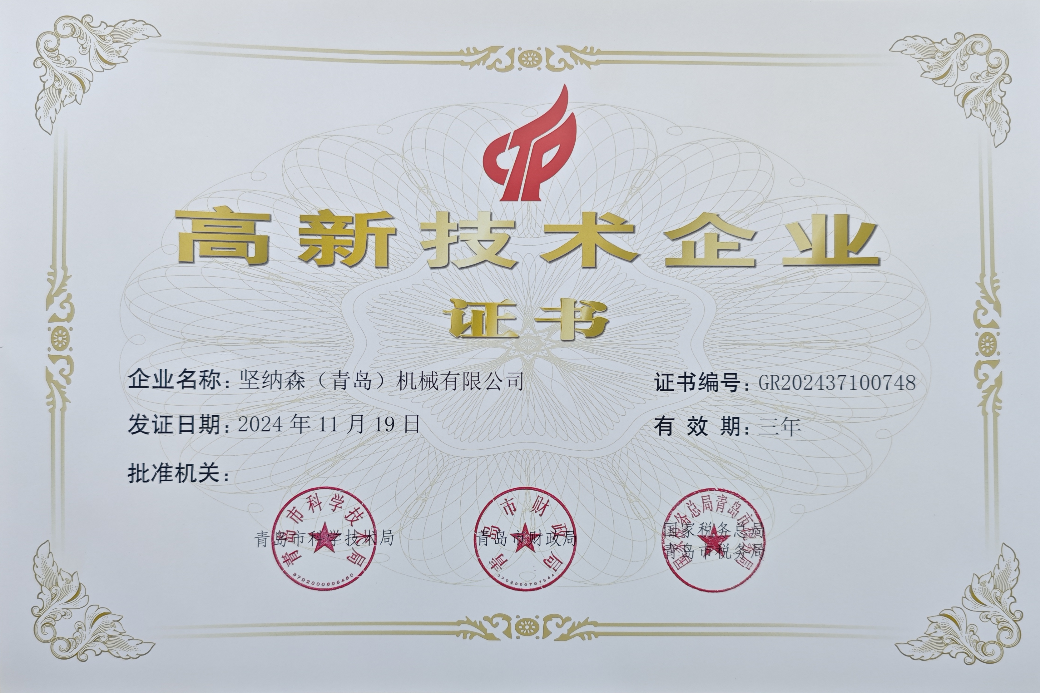• 熱烈祝賀堅納森(青島)機(jī)械有限公司榮獲“高新技術(shù)企業(yè)”再次認(rèn)定!